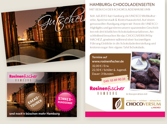 Rosinenfischer HamburgCorporate Design & WebsiteLogoentwicklung, Design, Website, Gestaltung der Werbemittel und Give-aways